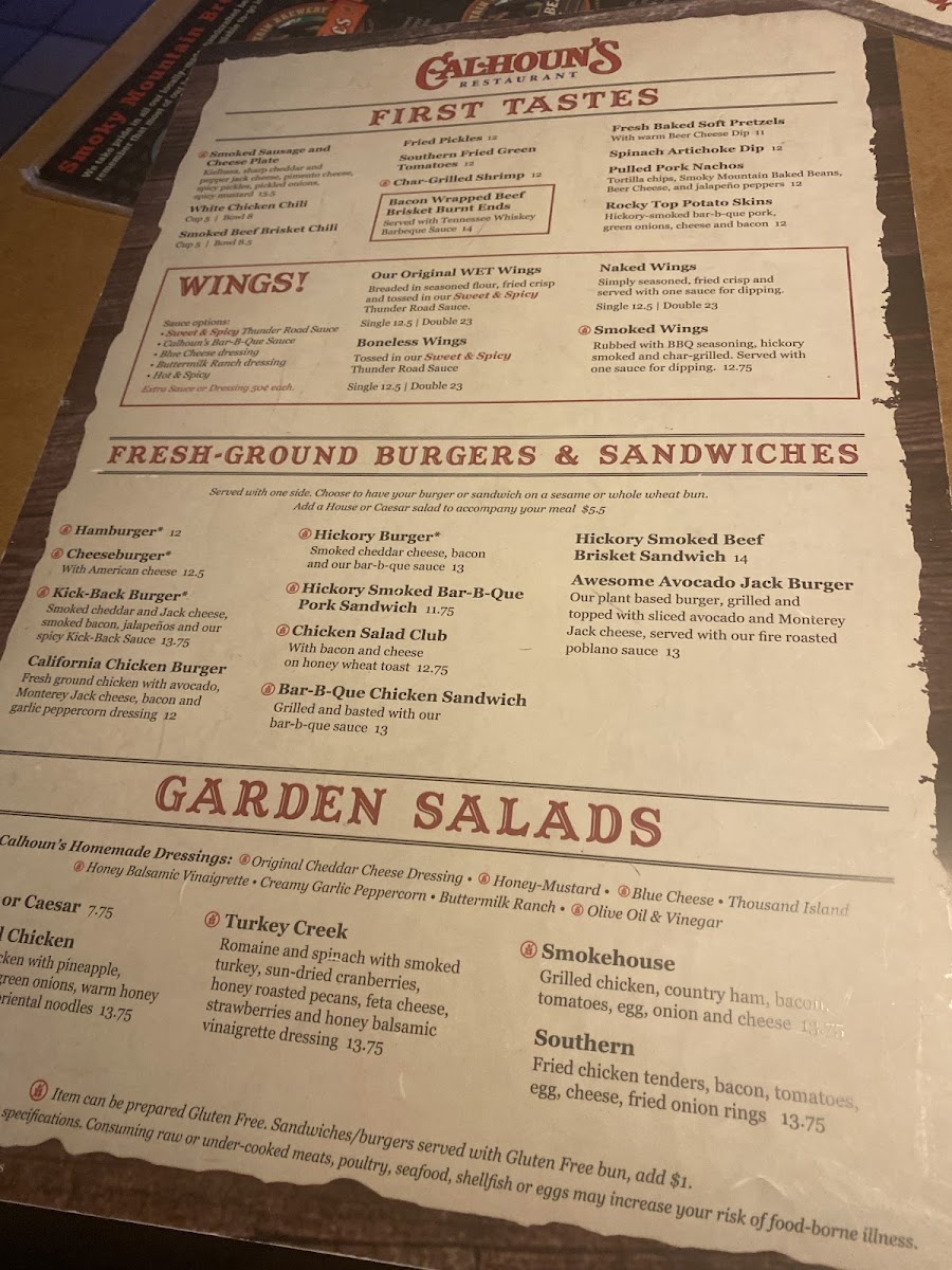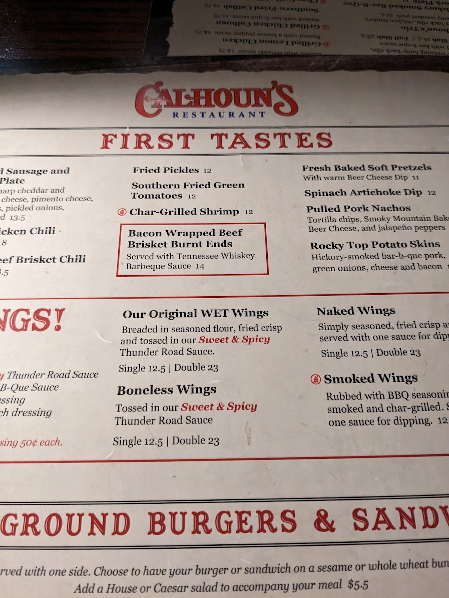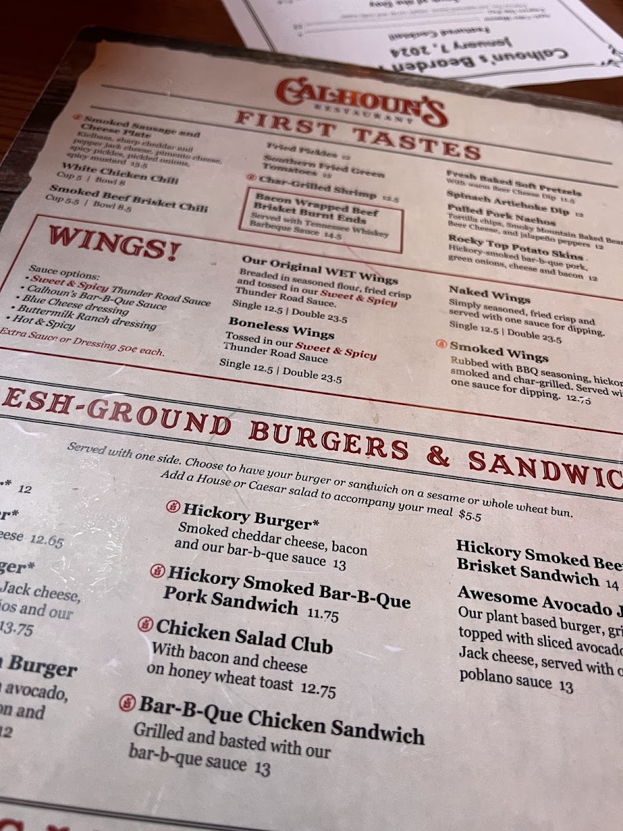 Introducing the menu at Calhoun's, located at 6515 Kingston Pike, Knoxville, TN, is a delightful culinary journey into Southern comfort food. Renowned for its warm atmosphere and attentive service, Calhoun's stands out with a variety of mouth-watering dishes. Signature items include the beef brisket, perfectly smoked and paired with mac & cheese and coleslaw, along with the irresistible boneless wings and spinach artichoke dip.