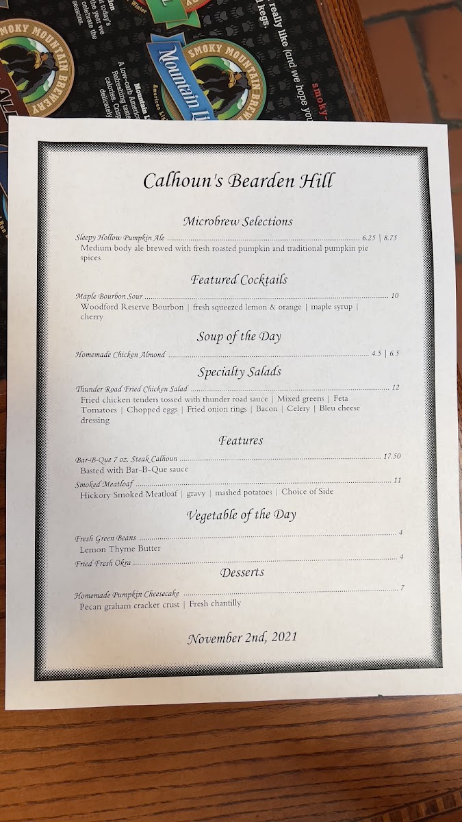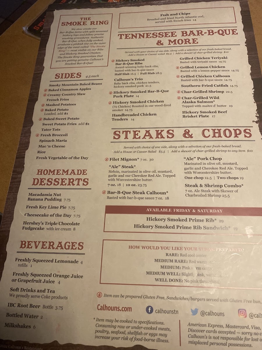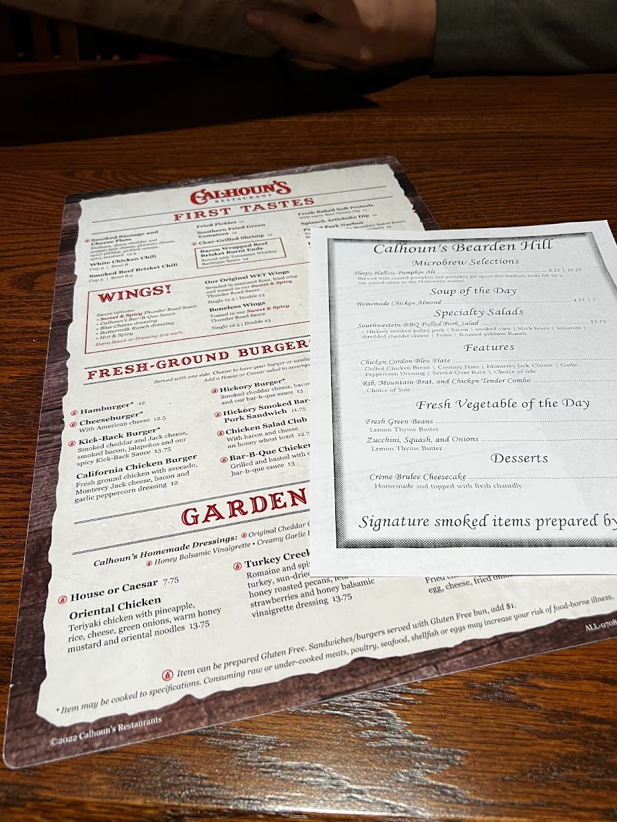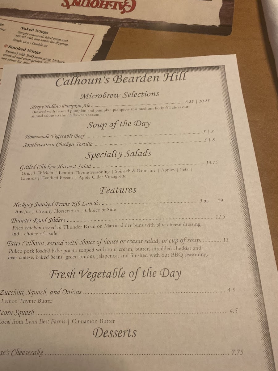 Introducing the menu at Calhoun's, located at 6515 Kingston Pike, Knoxville, TN, is a delightful culinary journey into Southern comfort food. Renowned for its warm atmosphere and attentive service, Calhoun's stands out with a variety of mouth-watering dishes. Signature items include the beef brisket, perfectly smoked and paired with mac & cheese and coleslaw, along with the irresistible boneless wings and spinach artichoke dip.